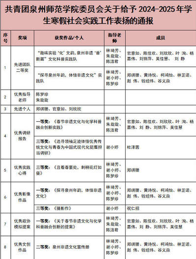 泉州388vip太阳集团2024-2025年学生寒假社会实践活动共评选19支实践队为“社会实践先进团队”,17名教师为“寒假社会实践优秀指导老师”,29位同学为“学生寒假社会实践先进个人”,17篇优秀调研报告,5篇优秀学术论文,12篇优秀实践心得,10份优秀影像作品,9份优秀政协提案,3份优秀文创作品。